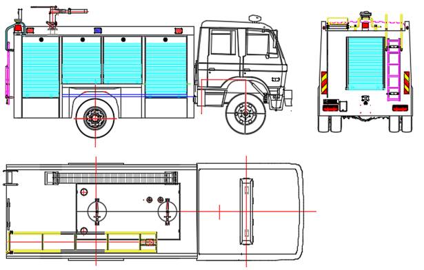 上裝結(jié)構(gòu)及性能參數(shù)總體布置 | 整車由消防員乘員室和車身兩大部分組成,車身布置采用內(nèi)藏罐式結(jié)構(gòu),左右兩側(cè)為器材箱,中部為水罐,器材箱后部為泵房。 |