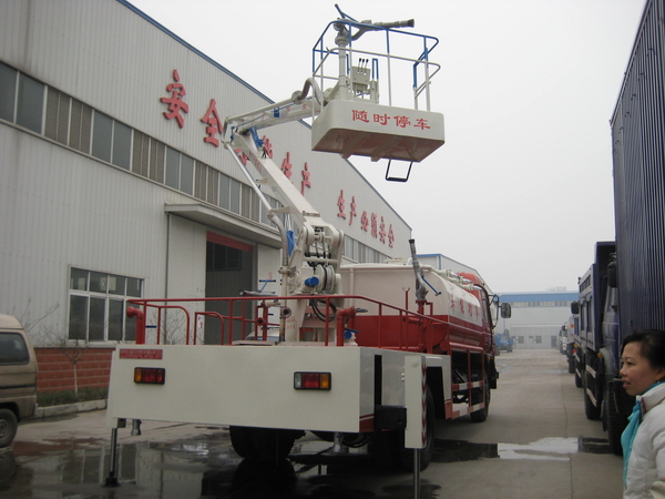 | 專用性能: | 罐體容積為6-7m3,具有自吸自排功能。前沖后灑、側(cè)噴,后置工作臺(tái),帶高壓槍,可調(diào)節(jié)成柱狀,射程≥28m,也可調(diào)節(jié)成霧狀,射程≥14m。廣泛適用園林,消防,電力。高空作業(yè)車專用功能:最大作業(yè)高度:12-14m; 回轉(zhuǎn)角度:360°最大作業(yè)半徑:7.5m; 乘斗載荷:200kg 帶吊吊1噸 該車是根據(jù)用戶要求定制,可在高空作業(yè)工作斗上舉高噴水,另外根據(jù)用戶要求,裝有灑水炮3個(gè),工作平臺(tái)上兩個(gè),高空作業(yè)斗上一個(gè)。 | ||