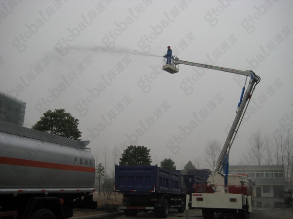 該車是根據(jù)用戶要求定制,可在高空作業(yè)工作斗上舉高噴水,另外根據(jù)用戶要求,裝有灑水炮3個(gè),工作平臺(tái)上兩個(gè),高空作業(yè)斗上一個(gè)。銷售熱線:135 9784 9802