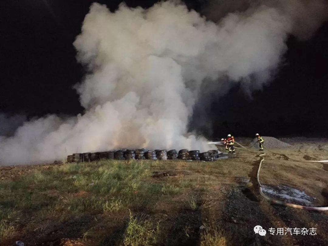 這是第二個輪胎滅火實驗:四百個充分燃燒的輪胎,火焰高度25米,采用江特MC3000壓縮空氣泡沫城市主戰(zhàn)消防車,3%AFFF泡沫液,僅用時1分53秒將明火打滅,用水1200升,泡沫液46升。